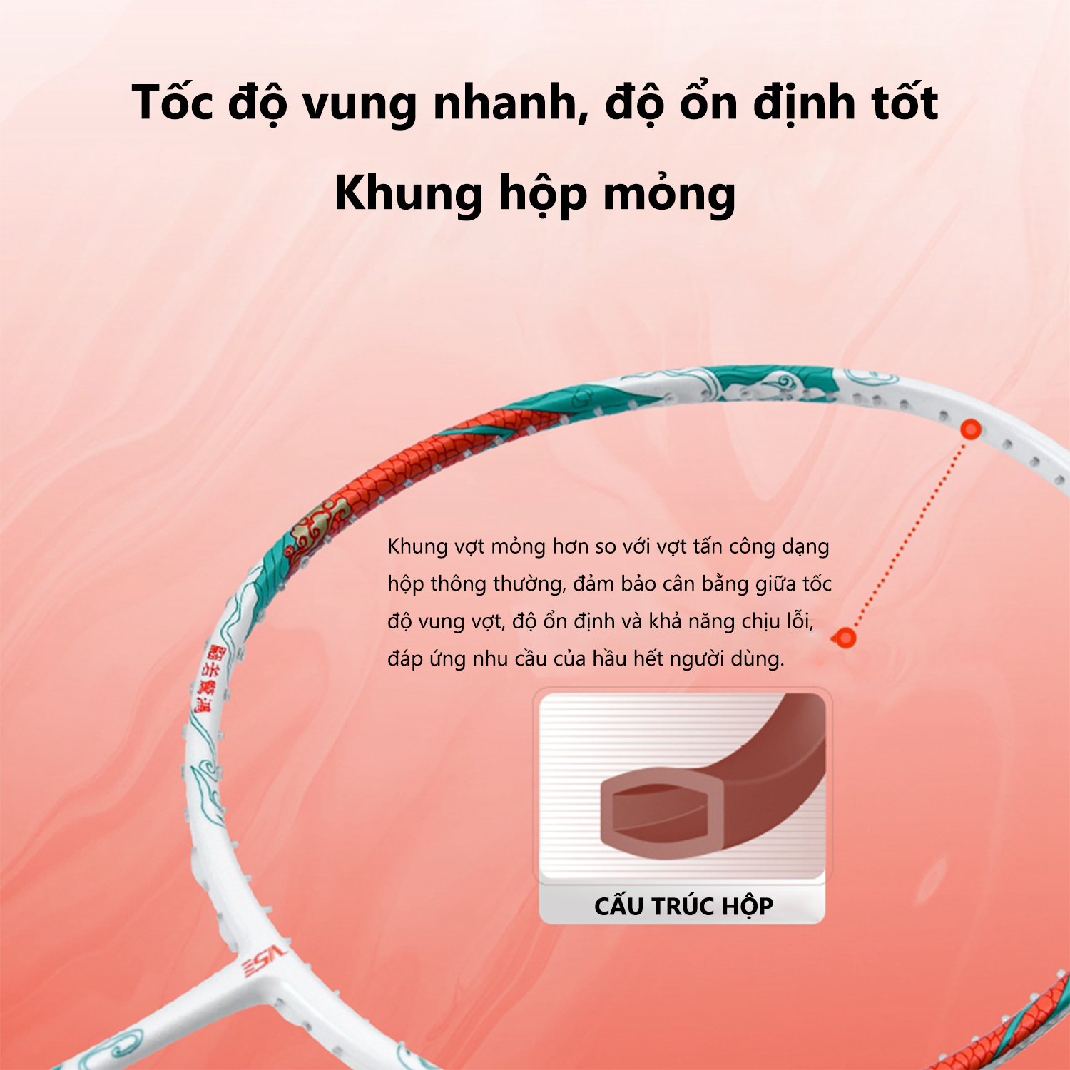 – BOX STRUCTUR: Cấu trúc khung dạng hình hộp giúp giảm lực cản không khí. Từ đó tạo ra những cú vung vợt nhanh và chính xác hơn.