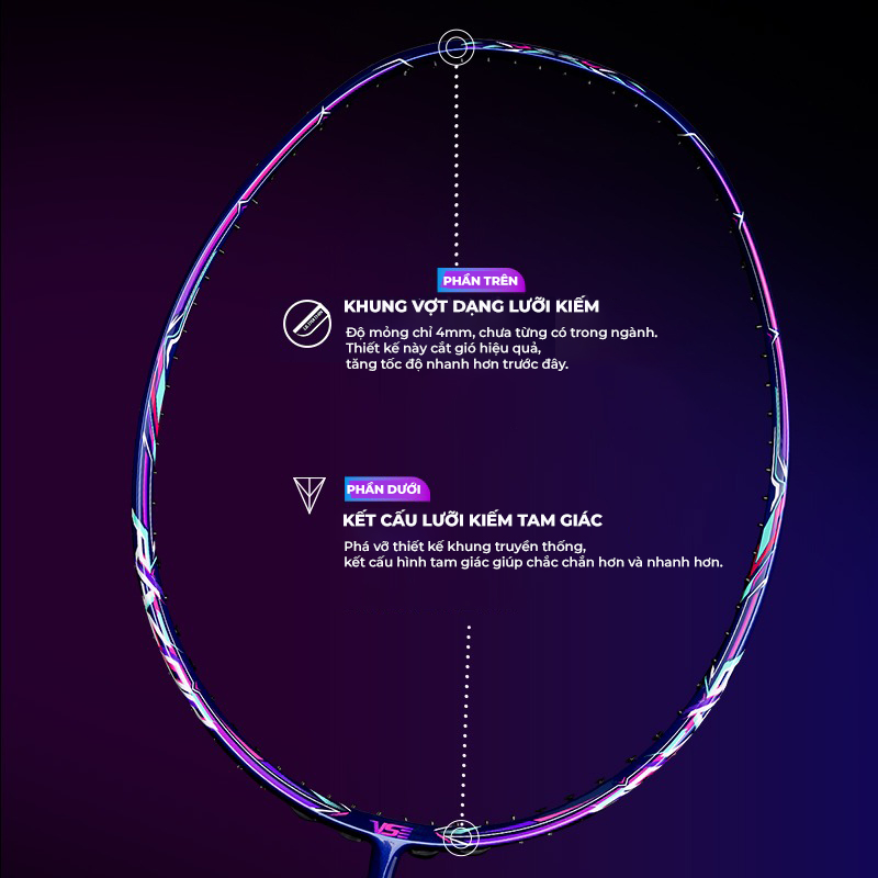 – RAZOR FRAME: Phần nữa trên khung vợt được vát mỏng chỉ 4mm, cấu trúc như chiếc lưỡi dao mang đến khả năng cắt gió, đem đến tốc độ lớn cho việc vung vợt nhanh hơn. Ngoài ra, phần khung VS Razor còn được tích hợp hình dạng khung lăn trụ tam giác để tạo nên một máy cắt gió thực thụ.