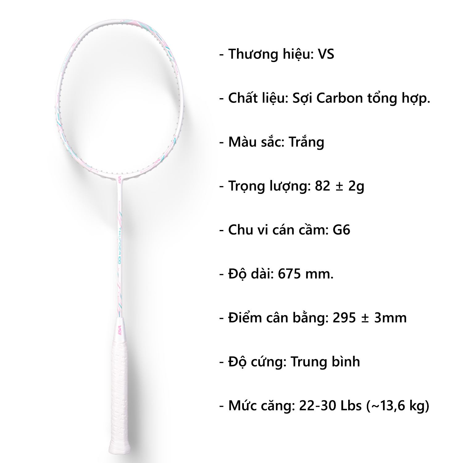 – Mức căng dây: 22-30 Lbs (~13,6 kg)
