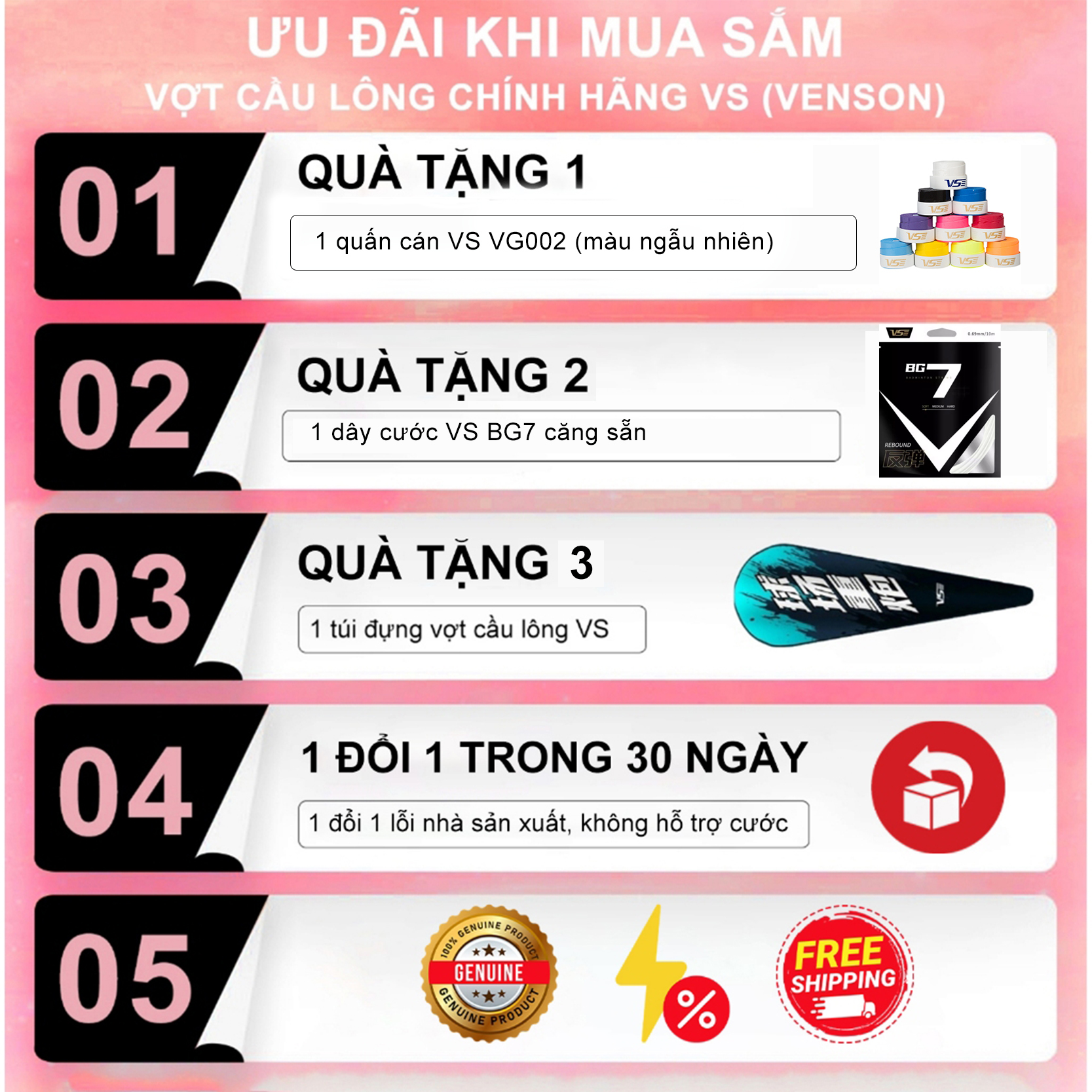 – 1 ĐỔI 1 TRONG 30 NGÀY: Đối với vợt sập khung, lỗi do nhà sản xuất. KHÔNG áp dụng với cước vợt và khung vợt hỏng, gãy do ngoại lực tác động, va chạm khi chơi cầu